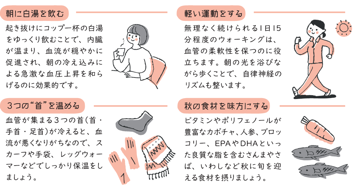 では、どうすればいいのでしょうか。今日からできる“血管を守る秋習慣”を4つご紹介します。