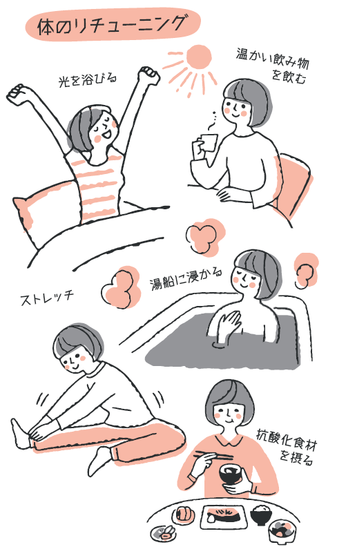 朝起きたら光を浴びること。体内時計をリセットし、自律神経を整える最初の一歩です。温かい飲み物で内臓を目覚めさせる。冷たい水よりも白湯や温かいお茶で血流をやさしく促します。ゆっくり湯船に浸かる。 深部体温を上げることで副交感神経が優位になり、睡眠の質も上がります。